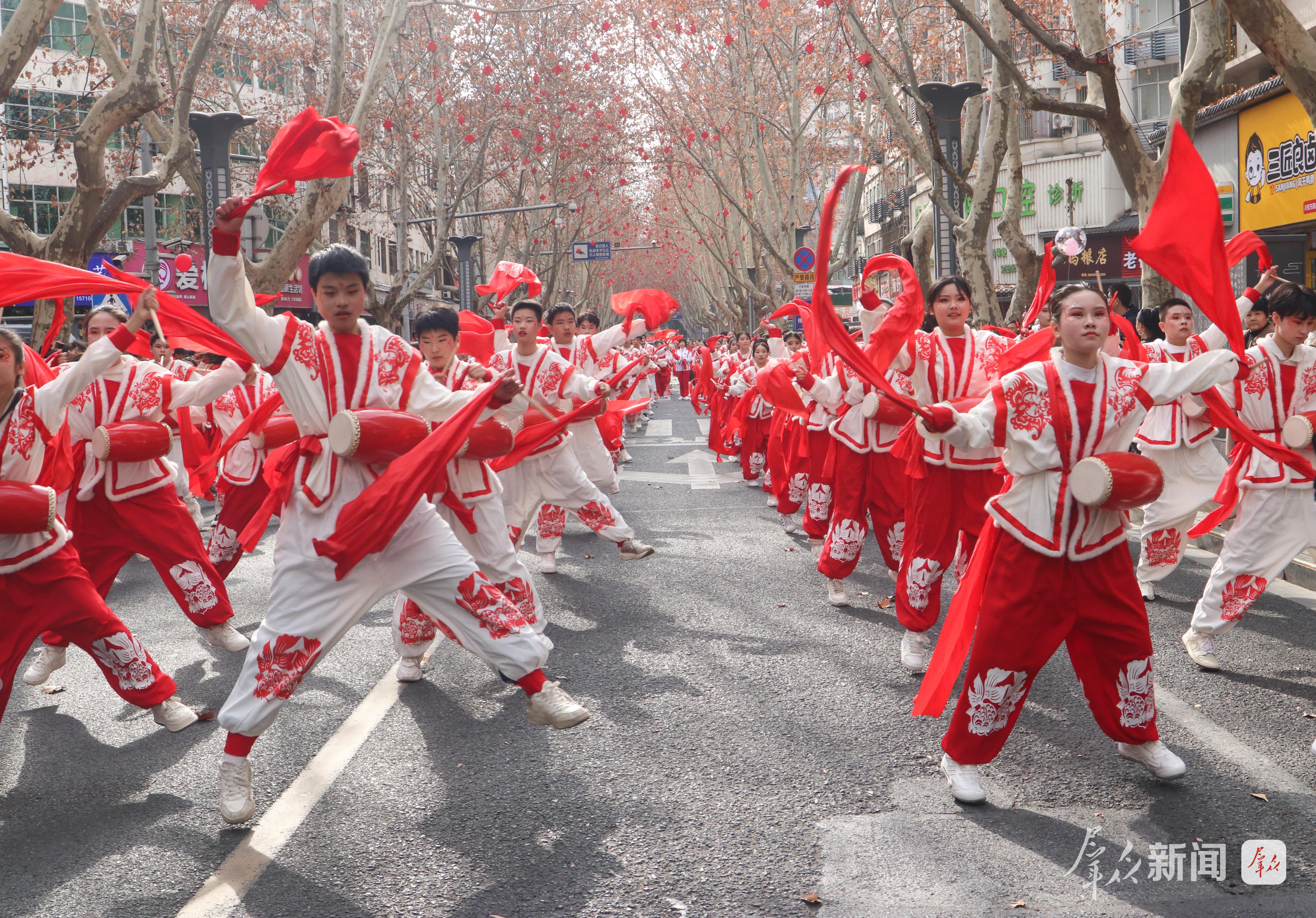 2月27日,演员在社火巡游中进行腰鼓表演。
