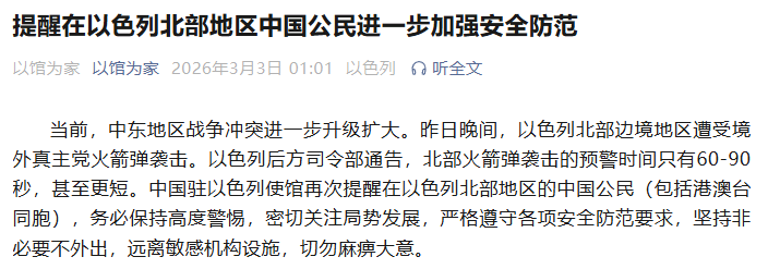 中国网3月3日讯 据中国驻以色列大使馆消息,当前,中东地区战争冲突进一步升级扩大。昨日晚间,以色列北部边境地区遭受境外真主党火箭弹袭击。以色列后方司令部通告,北部火箭弹袭击的预警时间只有60-90秒,甚至更短。中国驻以色列使馆再次提醒在以色列北部地区的中国公民(包括港澳台同胞),务必保持高度警惕,密切关注局势发展,严格遵守各项安全防范要求,坚持非必要不外出,远离敏感机构设施,切勿麻痹大意。