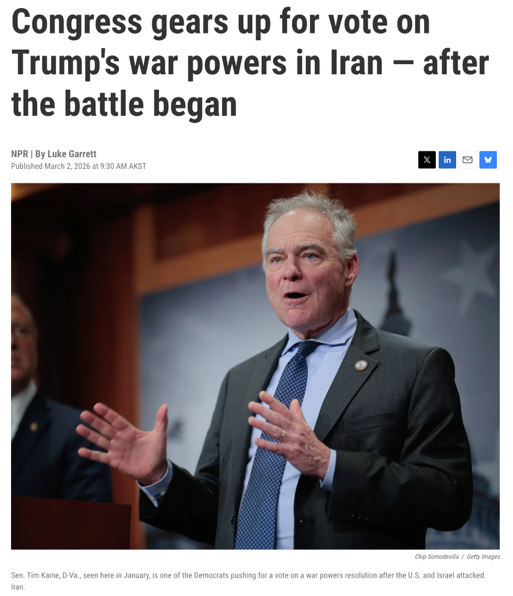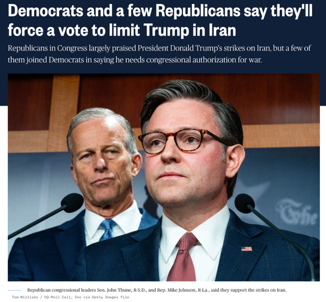 △美国国家公共广播电台报道,本周,国会将对旨在限制特朗普在伊朗军事行动的战争权力决议进行投票。
