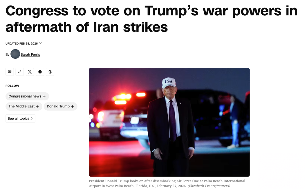 因此,这场即将到来的投票既是一项制度行动,更是一场鲜明的政治对峙,它就像一次“立场投票”:支持者希望捍卫宪法制衡原则,反对者则强调必须给予总统足够空间应对安全威胁。但即便无法形成直接约束,这一决议本身也会对未来军事决策形成政治压力,构成某种形式的软约束。