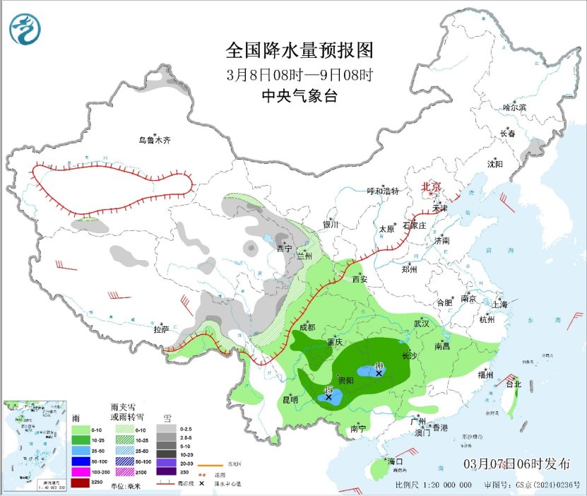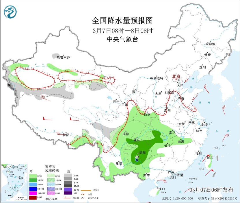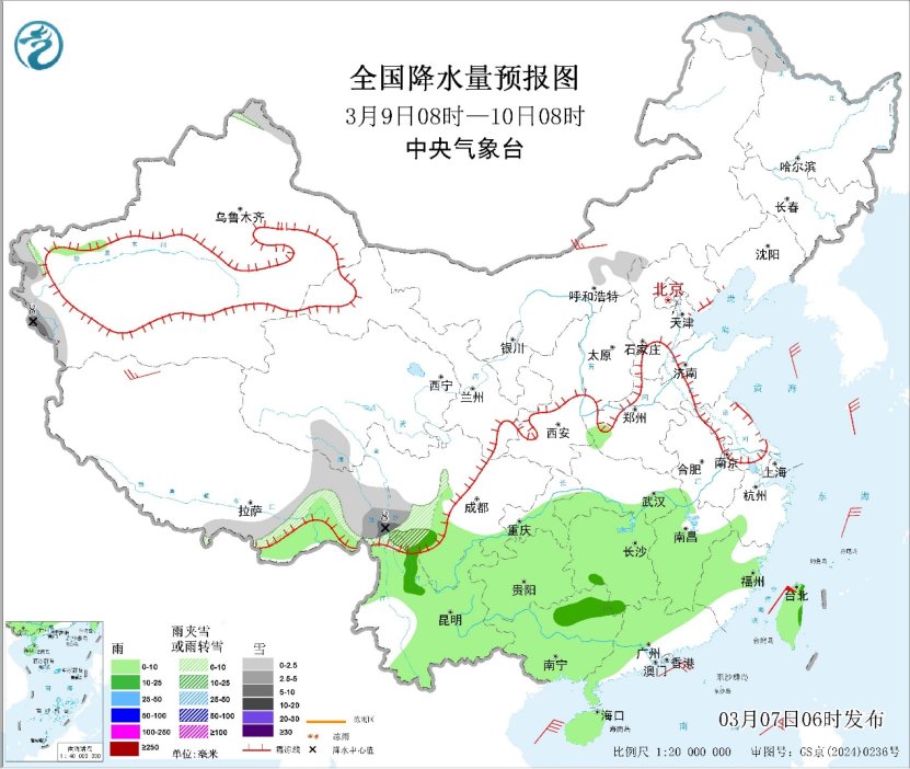 中国网3月7日讯 据中央气象台消息,昨日,降水主要出现在新疆西部和北部、陕西、山西、河南等地,上述部分地区出现小到中雪或雨夹雪,山西和河南局地出现大到暴雪。预计未来三天,北方降雪减弱,南方大部地区多阴雨天气,其中,贵州南部和东部、湖南西部、广西西北部等地局地有大雨;新疆西部和北部、西北地区东部、川西高原、西藏东部等地部分地区有小到中雪或雨夹雪,局地大雪。