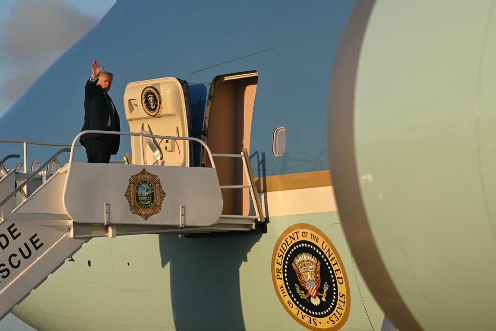 这是3月9日特朗普准备登上总统专机,从佛罗里达州返回首都华盛顿。法新社图片
