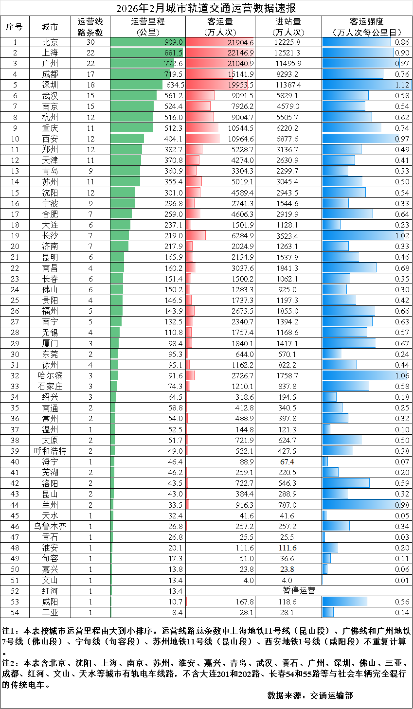 中国网3月10日讯 据交通运输部微信公众号消息,2026年2月,31个省(自治区、直辖市)和新疆生产建设兵团共有54个城市开通运营城市轨道交通线路345条,运营里程11778.2公里,实际开行列车335万列次,完成客运量21.7亿人次,进站量13亿人次。2月份,客运量环比减少7.2亿人次,降低25%,同比减少2.3亿人次,降低9.6%。2月份全国总运营里程的平均客运强度为0.659万人次每公里日。