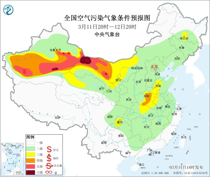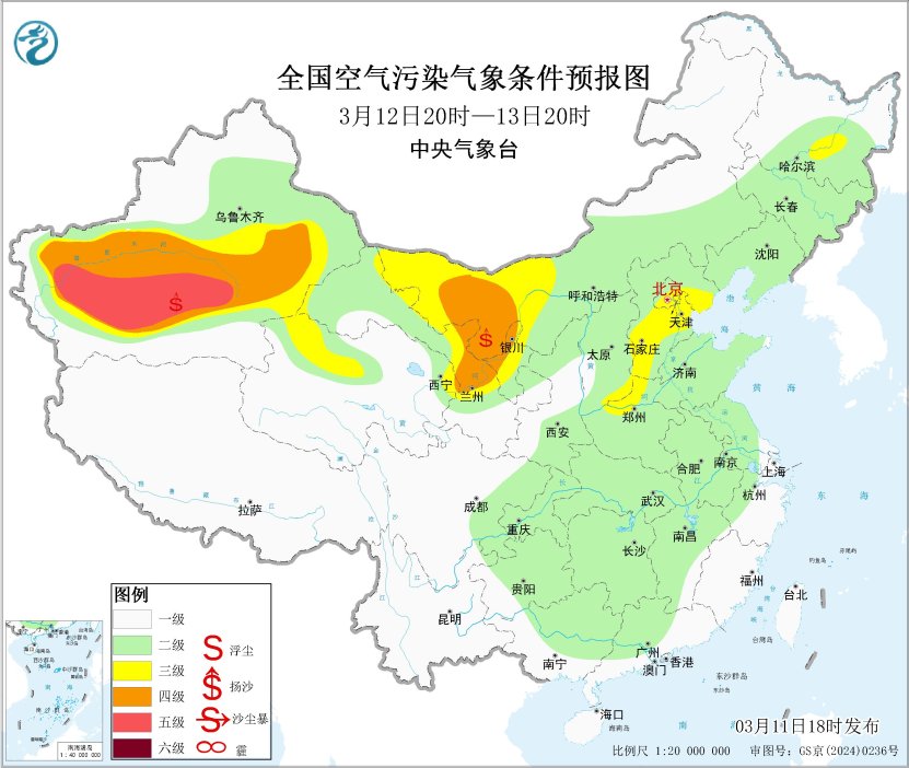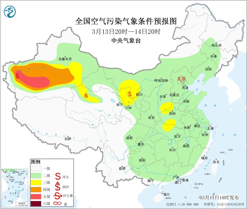 中国网3月11日讯 据中央气象台消息,未来一周,全国大部地区大气扩散和湿清除条件较好,无持续性霾天气。受大风天气影响,11日夜间至13日,我国西北地区有沙尘天气。中央气象台于3月11日18时继续发布沙尘暴蓝色预警。预计,3月11日20时至12日20时,新疆东部和南部、内蒙古西部、甘肃西部、青海北部、宁夏中北部等地的部分地区有扬沙或浮尘天气,其中,新疆吐鲁番盆地和南疆盆地东部、内蒙古西部、甘肃西部局地有沙尘暴或强沙尘暴。