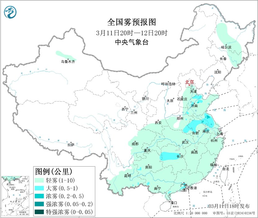 此外,11日夜间至12日上午,山东北部、河南东南部、江苏、安徽中北部、贵州西部、广东西南部等地的部分地区有大雾,局地能见度低于200米。