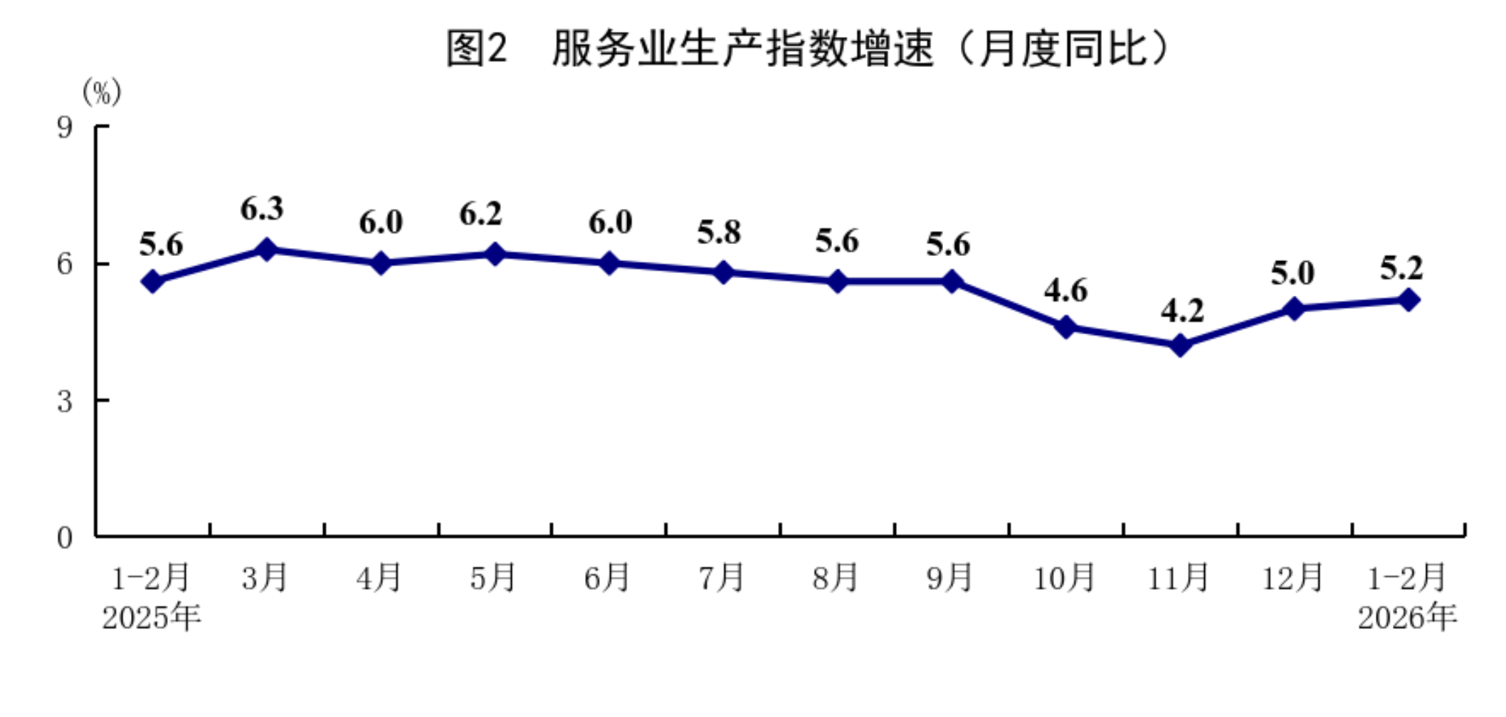 1—2月份,全国服务业生产指数同比增长5.2%,比上年12月份加快0.2个百分点。分行业看,信息传输、软件和信息技术服务业,租赁和商务服务业,金融业,交通运输、仓储和邮政业,住宿和餐饮业生产指数分别增长10.1%、8.2%、7.0%、6.3%、5.4%。2月份,服务业商务活动指数为49.7%,比上月上升0.2个百分点;服务业业务活动预期指数为55.8%。其中,住宿、餐饮、文化体育娱乐等行业商务活动指数位于60.0%以上高位景气区间。