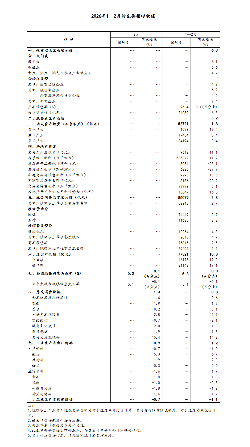 1—2月份,全国固定资产投资(不含农户)52721亿元,同比增长1.8%,上年全年为下降3.8%;扣除房地产开发投资,全国固定资产投资增长5.2%。分领域看,基础设施投资同比增长11.4%,制造业投资增长3.1%,房地产开发投资下降11.1%。全国新建商品房销售面积9293万平方米,同比下降13.5%;新建商品房销售额8186亿元,下降20.2%。分产业看,第一产业投资同比增长17.4%,第二产业投资增长5.4%,第三产业投资下降0.4%。民间投资同比下降2.6%,降幅比上年全年收窄3.8个百分点;扣除房地产开发投资,民间投资增长1.0%。高技术产业投资同比增长5.1%,其中航空、航天器及设备制造业,研发与设计服务业,信息服务业投资分别增长20.2%、20.6%、16.5%。从环比看,2月份固定资产投资(不含农户)比上月增长0.39%。