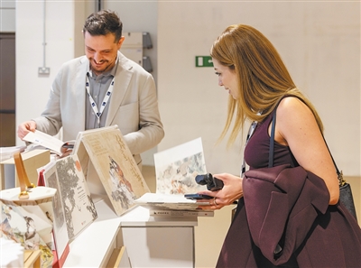 两名参展商在中国联合展台翻阅《红楼梦》画册。记者 许立群摄