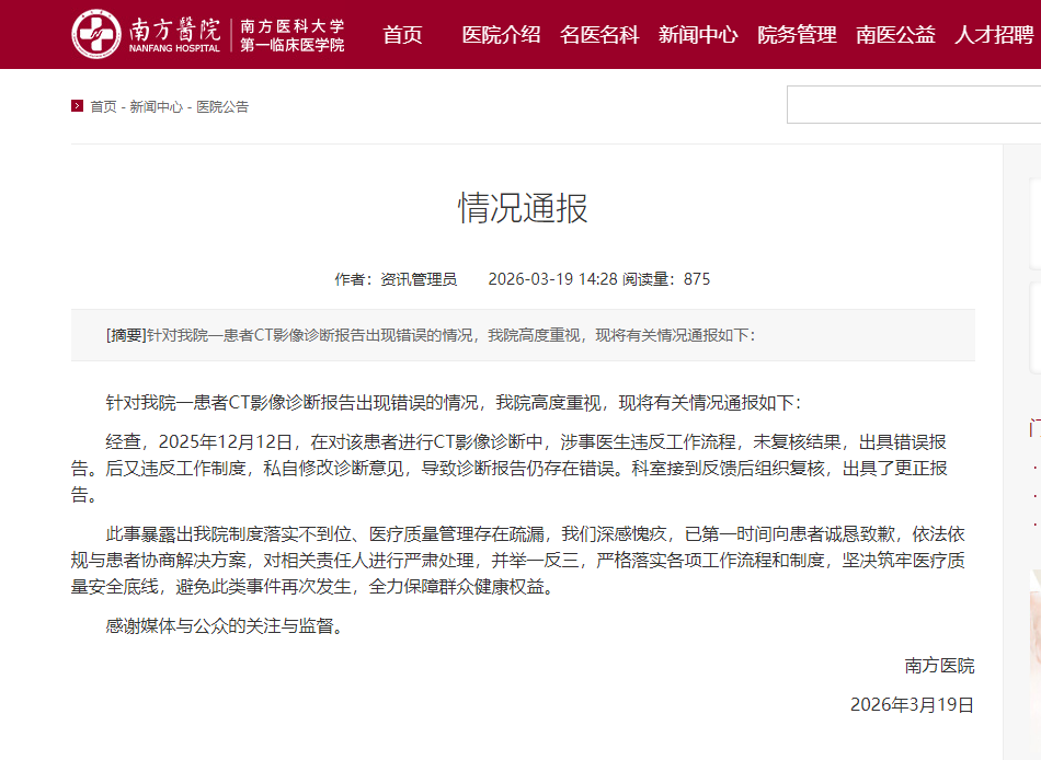 中国网3月19日讯 针对“患者CT影像诊断报告出现错误”一事,南方医科大学南方医院19日发布情况通报。