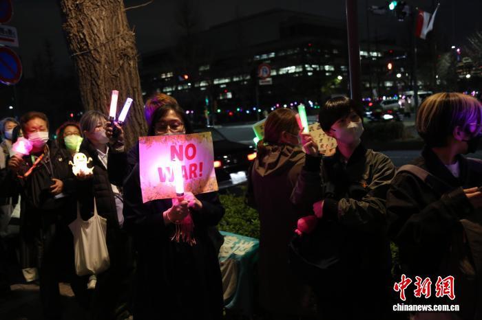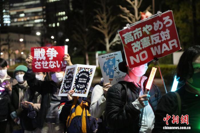 当晚,现场抗议者手举“不要战争”“反对修宪”等标语牌,呼吁维护和平宪法,守护和平。
