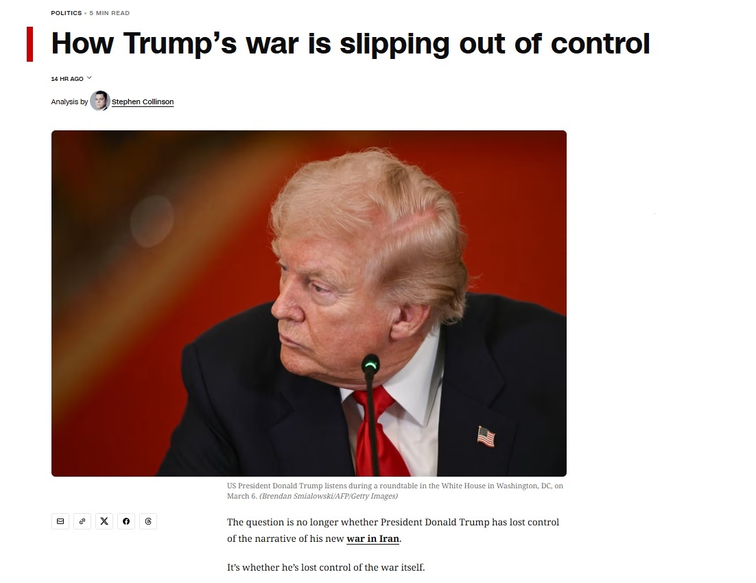 美国和以色列对伊朗发动的军事打击已持续超过20天。美国有线电视新闻网刊文称,如今,问题已不再是美国政府是否失去了对这次军事行动的主导权,而是其是否已经失去了对局势的控制权。
