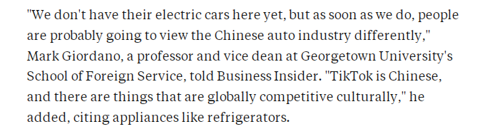 乔治城大学外交学院副院长、教授马克·乔尔达诺在文章中表示:“我们这里还没有他们的电动汽车,中国的电动汽车一旦进入美国市场,人们对中国汽车产业的看法很可能会改变。”