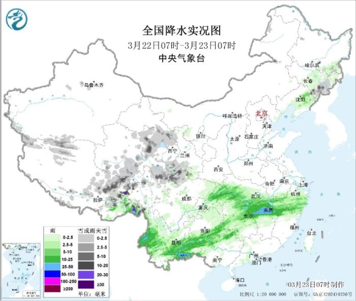 中国网3月23日讯 据中央气象台网站消息,昨日,青海北部、甘肃中部和南部、川西高原北部、西藏中东部、吉林东部等地出现小到中雪或雨夹雪,江西中部、湖南东北部、贵州南部、广西北部、云南西部和南部等地出现中到大雨,云南南部等局地暴雨。