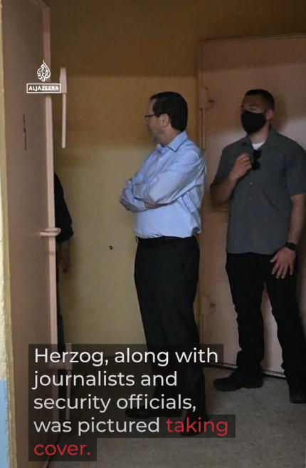 卡塔尔半岛电视台称,以色列总统赫尔佐格也被迫同安保官员以及记者们一起紧急躲避。