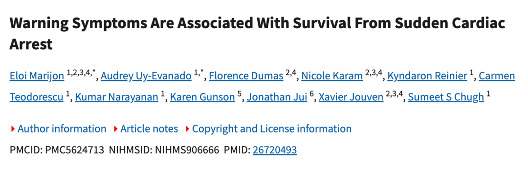 2016《内科学年鉴》刊发的一篇文章,首次大规模证实心脏骤停前存在可识别的预警症状,打破了“猝死毫无征兆”的传统认知。研究纳入的839名心脏骤停患者中,430名有先兆症状,占51%,主要为:胸痛、呼吸困难、头晕。①