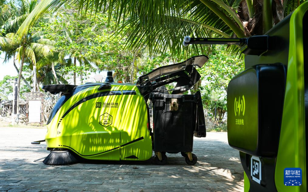小蜜蜂智慧清洁机器人在位于海南省琼海市潭门镇排港村作业(3月25日摄)。