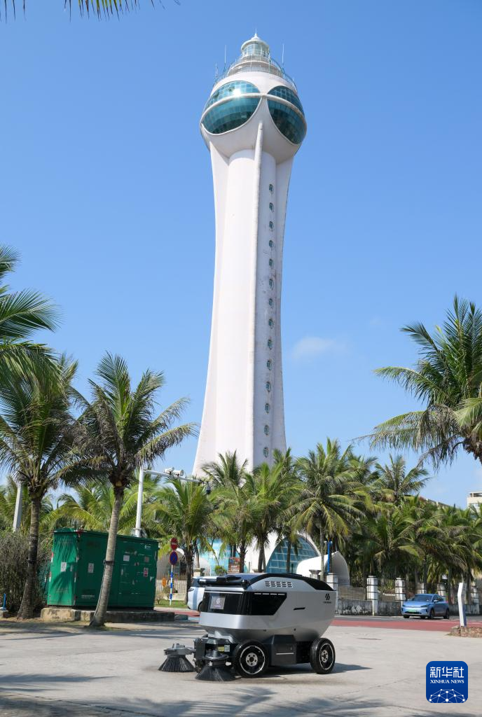 智能清扫机器人在海南省琼海市博鳌镇街头作业(3月25日摄)。