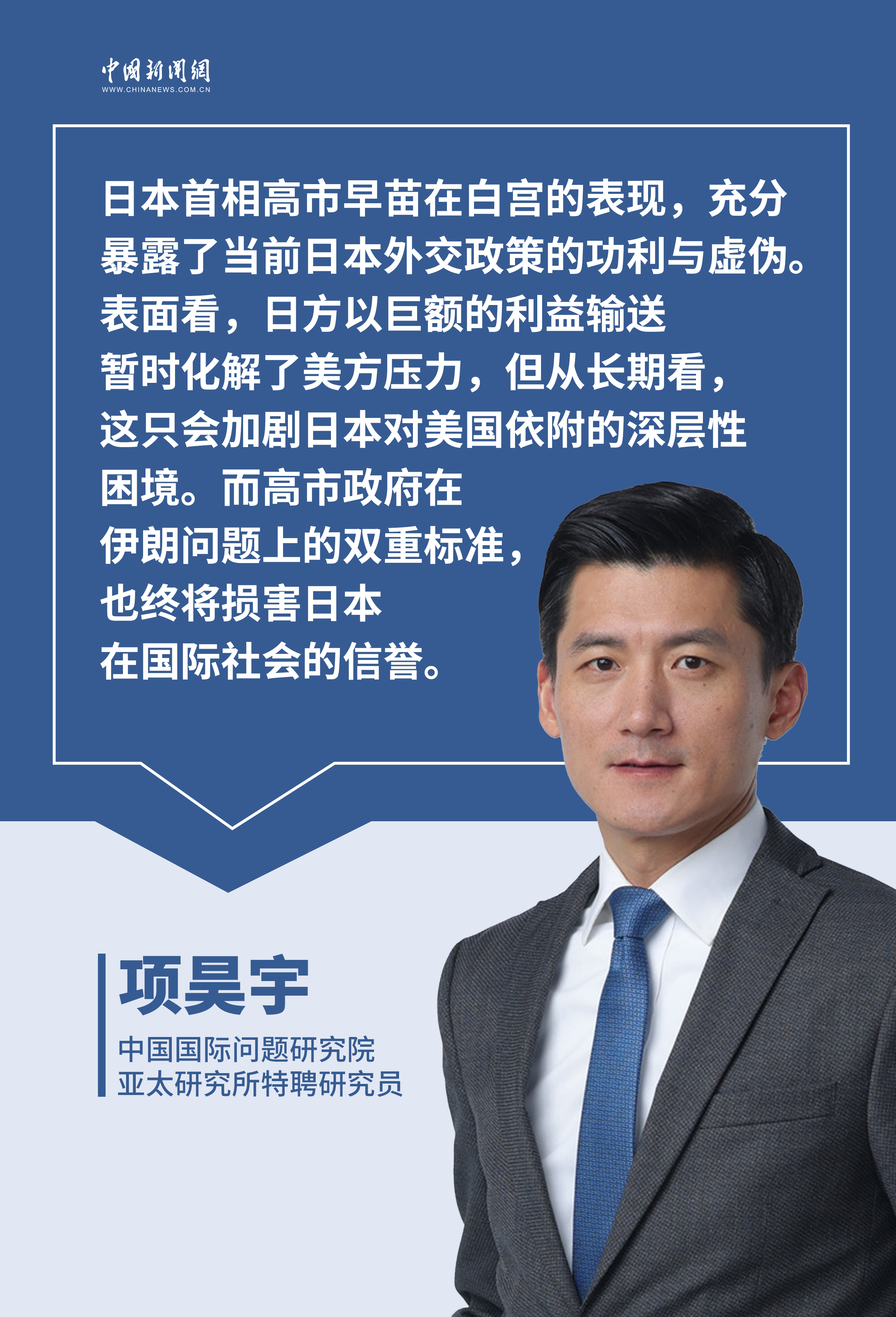 中国国际问题研究院亚太研究所特聘研究员项昊宇对中新网指出,高市此行已沦为日本以巨额代价对美国“表忠心”的一场“外交秀”。