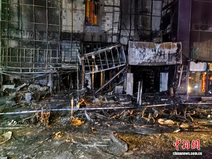29日1时许,起火建筑物东侧楼体外墙可见大面积燃烧痕迹,紧邻通道的几间门面房过火,受损严重。门面房前边有多辆电动自行车被烧成铁架子。