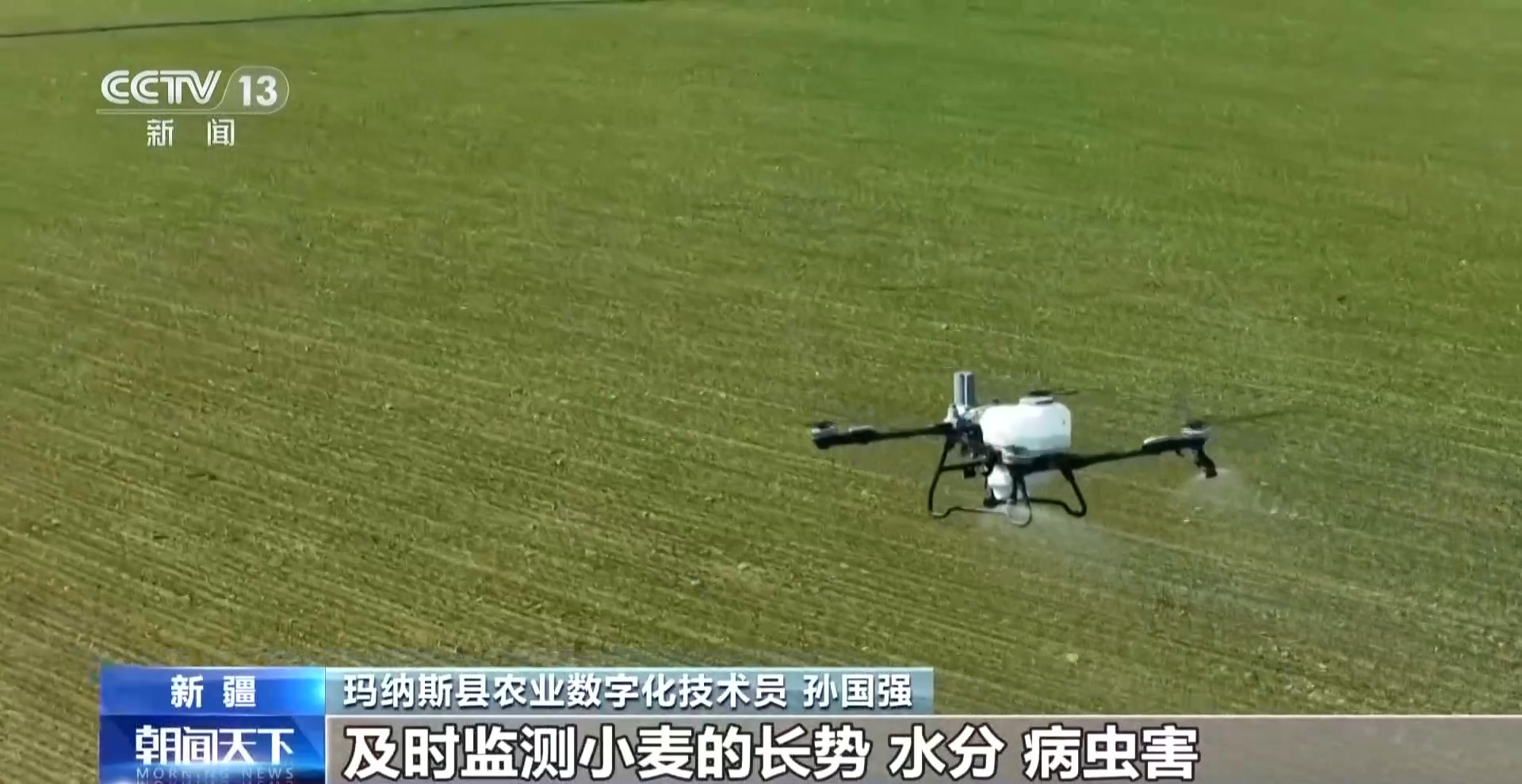 阜康市滋泥泉子镇何家湾中心村种粮大户 李传祥:镇上的技术员和我一起来田间地头看了一下,个别地块有冻伤情况,需要无人机飞防叶面肥。现在的无人机打药特别方便,一上午就飞完了,希望今年有个好收成。
