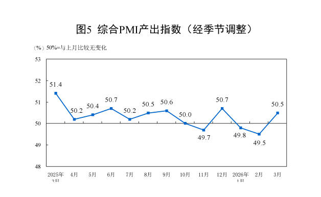 3月份,综合PMI产出指数为50.5%,比上月上升1.0个百分点,高于临界点,表明我国企业生产经营景气水平总体向好。