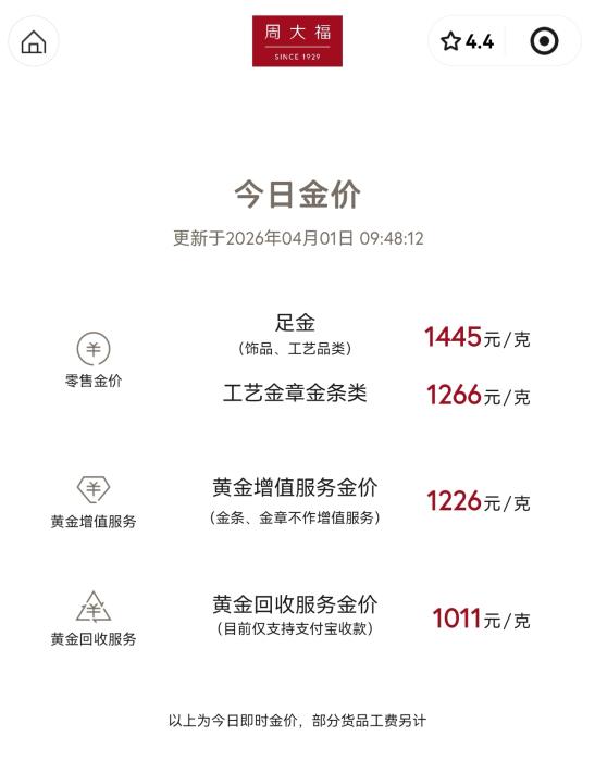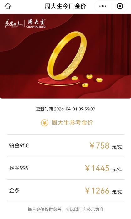 中新网4月1日电 4月1日,伦敦现货黄金早盘走高。受国际金价波动影响,国内金店再次上调金饰价格,周大福、周大生足金饰品价格上调至1445元/克,一夜涨50元;周生生足金饰品价格上调至1447元/克,一夜涨47元。