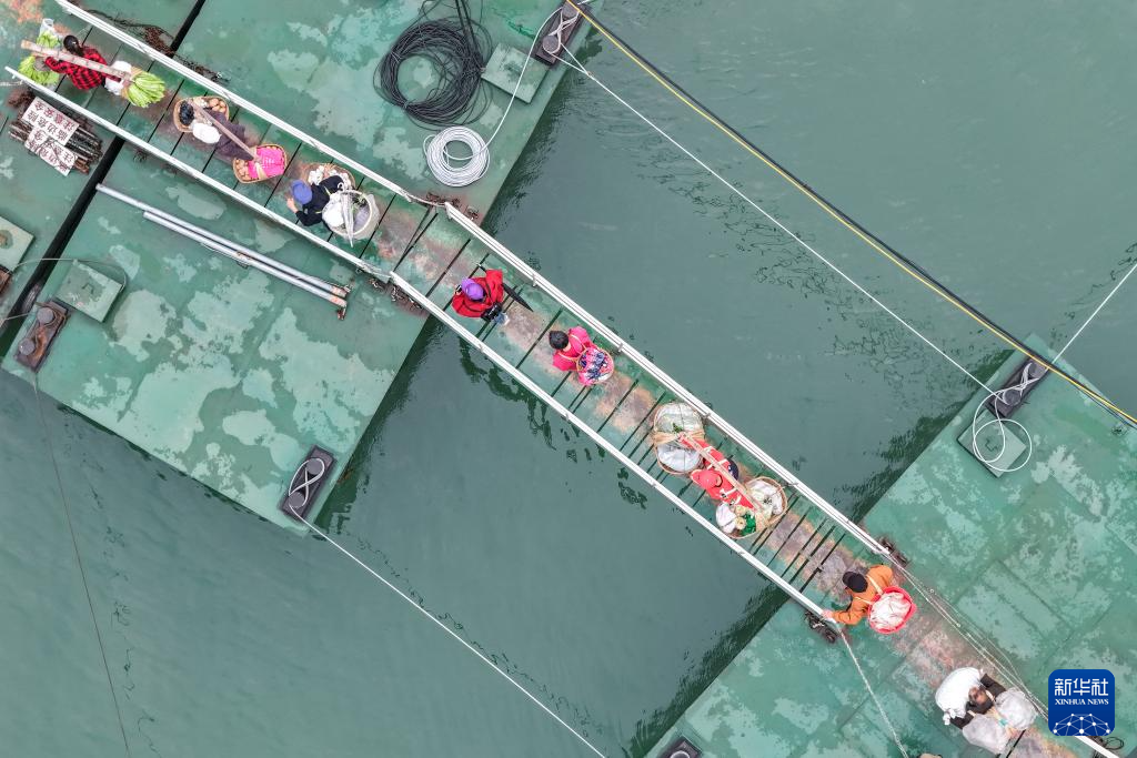 3月31日,在长江重庆忠县段,菜农登上“新渝忠客2180”客轮,准备前往县城西山码头(无人机照片)。