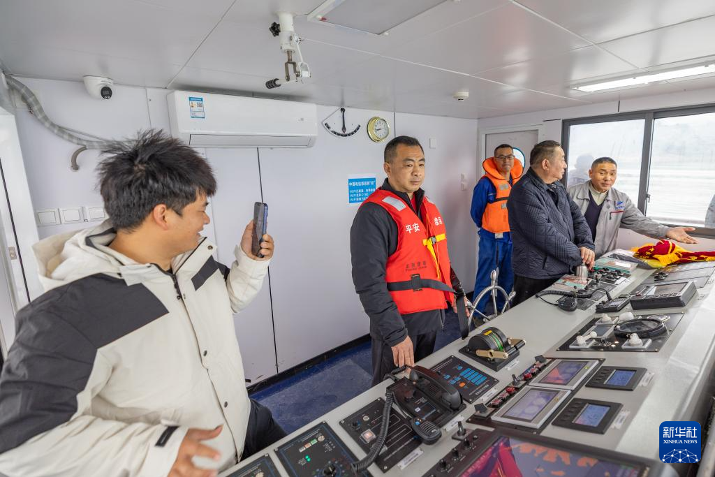 3月31日,在长江重庆忠县段,“新渝忠客2180”客轮船长秦大益(左二)在驾驶舱操控船舶,儿子秦源泽(左一)在网络平台上进行直播。