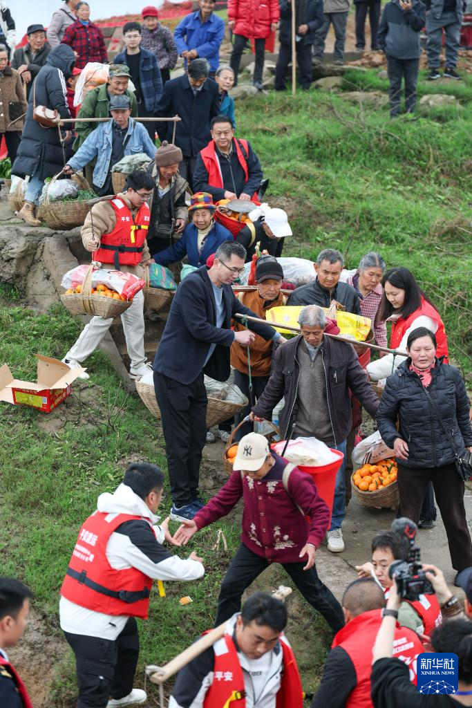 3月31日,在长江重庆忠县段,菜农在志愿者的帮助下登上“新渝忠客2180”客轮。