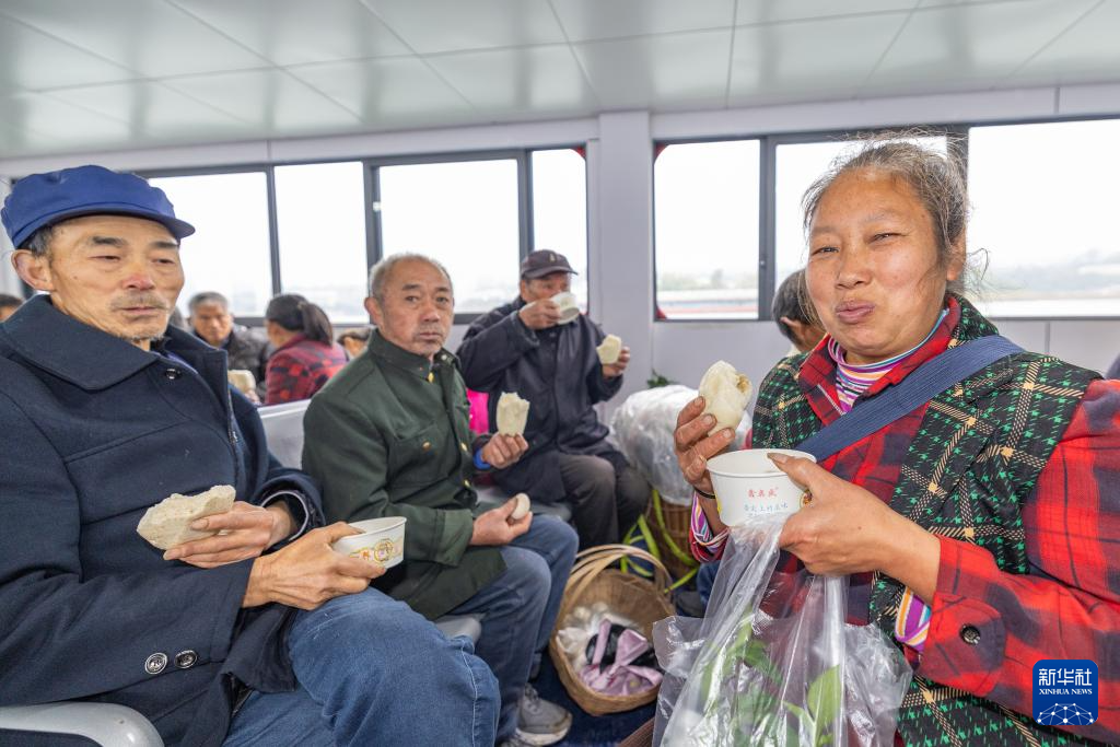 3月31日,在长江重庆忠县段,乘客在“新渝忠客2180”客轮开行过程中品尝免费爱心早餐。