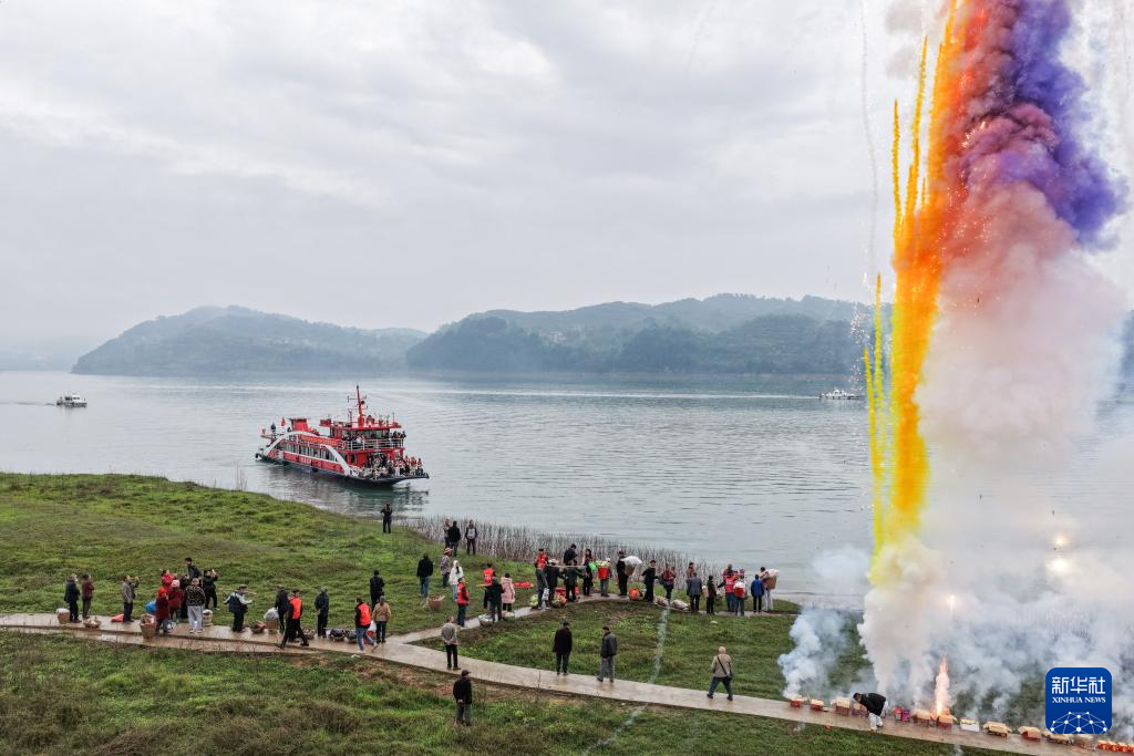 3月31日,在长江重庆忠县段,人们自发点燃烟花庆祝“新渝忠客2180”客轮的首航(无人机照片)。