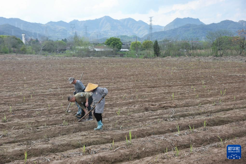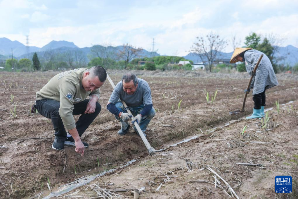 4月1日,丰江周村村干部(左)与村民在甘蔗地里查看甘蔗苗生长情况,沟通解决种植养护过程中遇到的问题。
