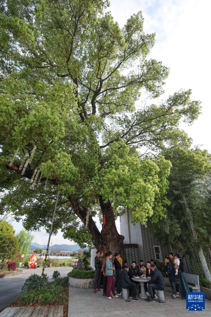 4月1日,丰江周村村干部、社区民警和村民围坐在大樟树下开议事会。