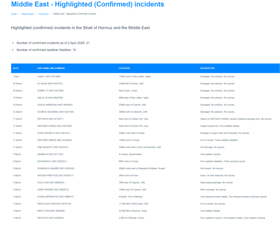 英国海事贸易行动组织(UKMTO)同样报告了这些袭击事件。该组织称,在2026年2月28日至4月2日期间,UKMTO总共收到了26份在霍尔木兹海峡及其周边海域航行船舶遭遇事故的报告,包括16份袭击事件报告和10份可疑活动报告。尽管UKMTO没有公布被袭击船只的船名,但根据其记录的事件发生的日期和地点,能够在IMO公布的列表中找到对应的事件。
