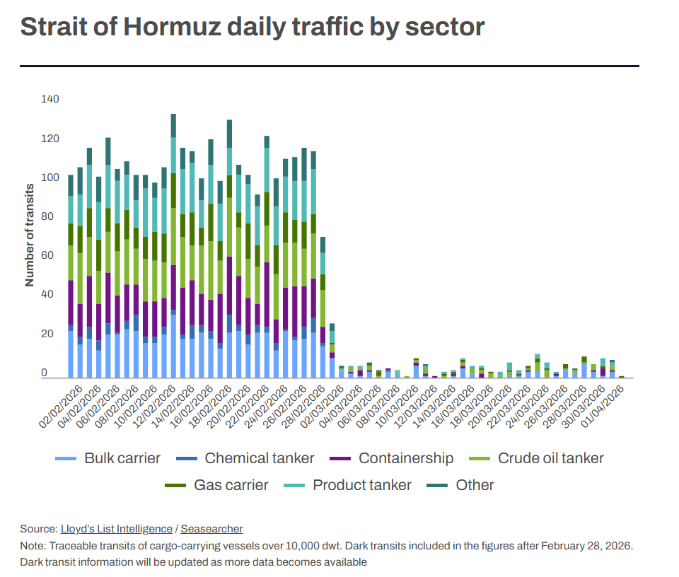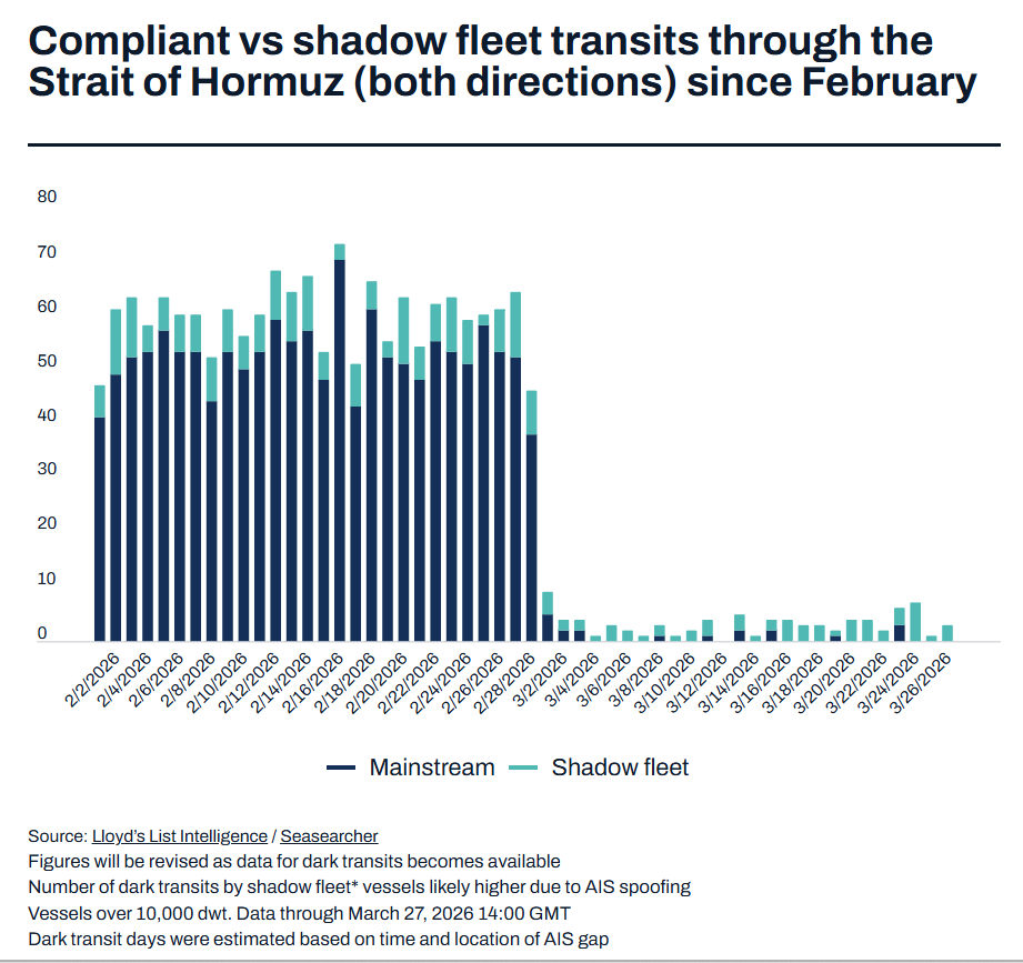 劳氏的情报分析师指出,在通过霍尔木兹海峡的船次中,运载伊朗石油和液化石油气的“影子船队”(shadow fleet)的比例十分可观,到3月下旬几乎占到了总数的80%。这一现象在开战以前同样存在,但当时仅占总数的约15%。