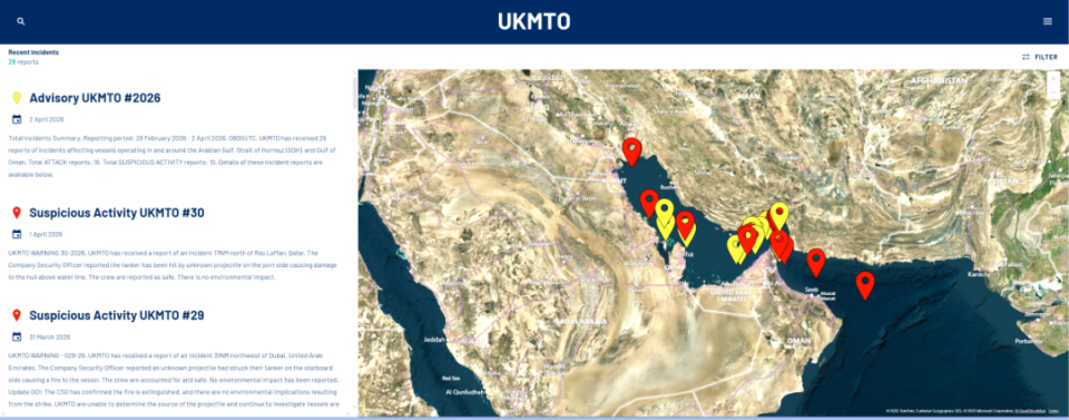 英国海事贸易行动组织(UKMTO)声称在2026年2月28日至4月2日期间总共收到了26份在霍尔木兹海峡及其周边海域航行船舶遭遇事故的报告。