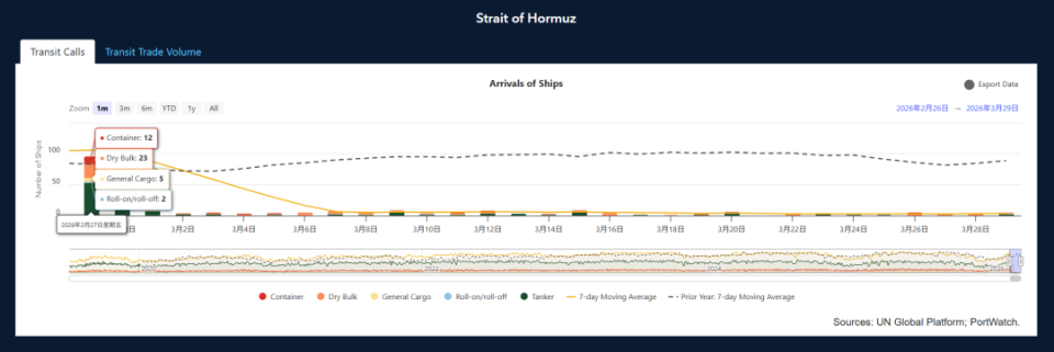 国际货币基金组织港口追踪平台IMF PortWatch从霍尔木兹港口获取的数据也反映了相似的趋势,2月28日记录的干散货、杂货、集装箱、油轮和滚装船的船只过境数量为76艘次,3月1日至3月29日间的通航总数仅有135艘次。