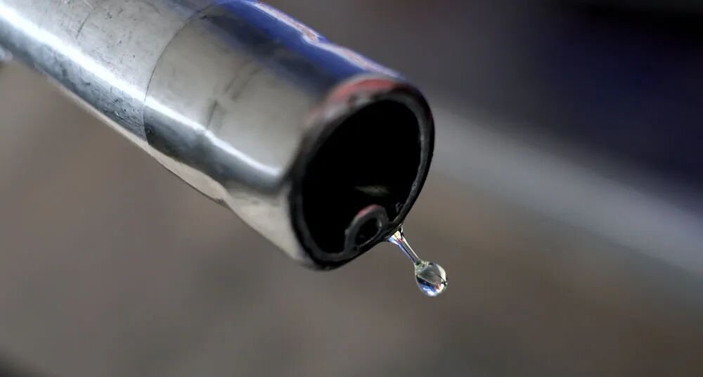 3月26日,在英国伦敦一处加油站,汽油从油枪口滴落。新华社记者 李颖 摄