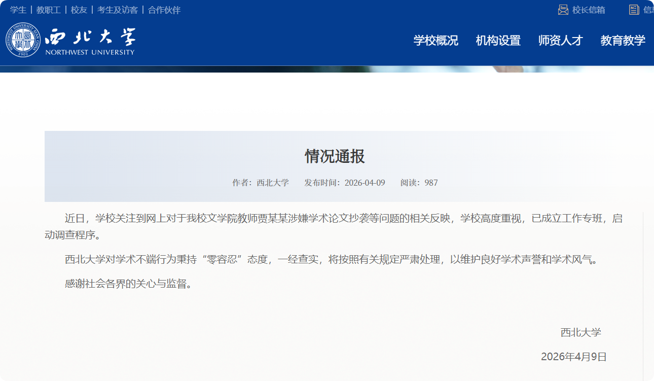 中国网4月9日讯 西北大学4月9日发布情况通报,回应该校教师贾某某涉嫌学术论文抄袭等问题。
