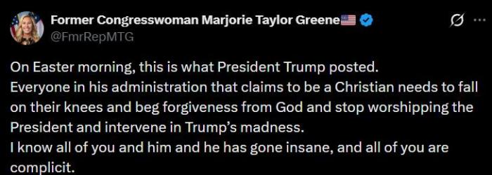 特朗普曾经的盟友玛乔丽·泰勒·格林,更是在社交媒体上直言特朗普“已经疯了”:“我认识你们所有人,也认识他(特朗普),他已经疯了,而你们所有人都是同谋。”