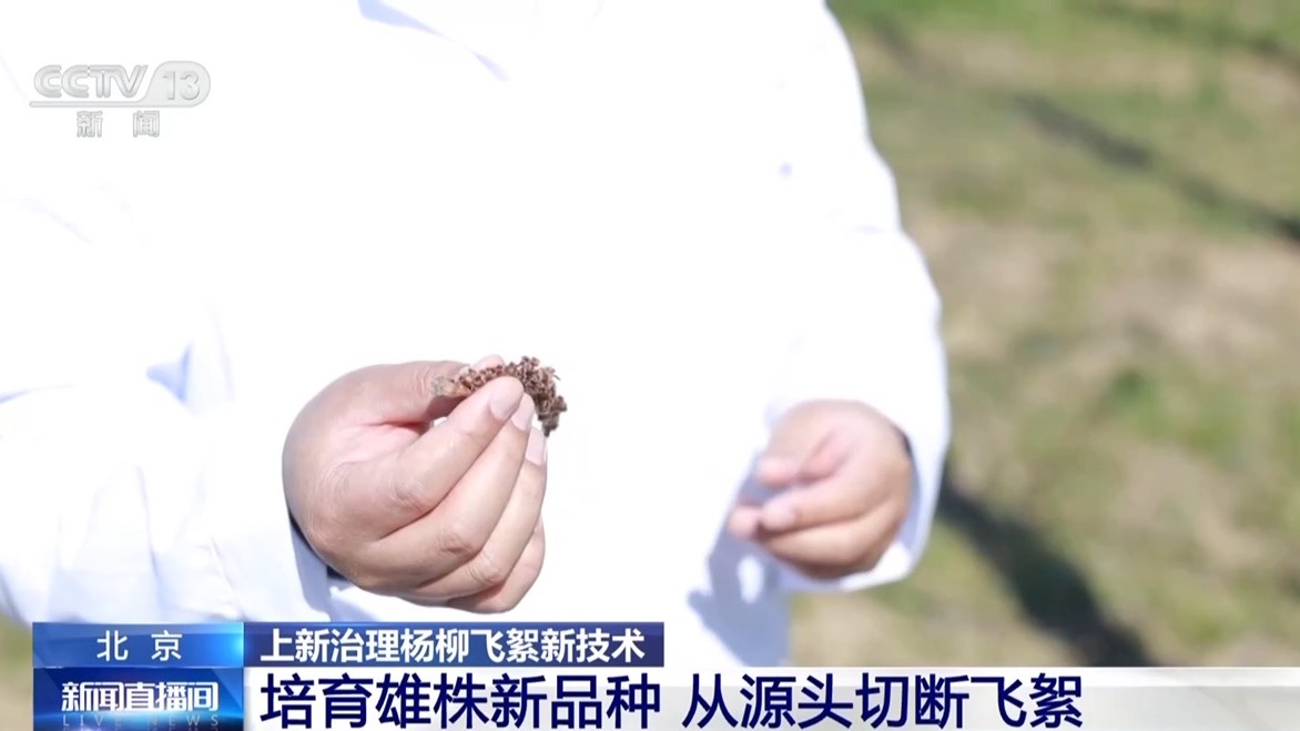 北京林业大学教授、林木遗传育种全国重点实验室副主任 杜庆章:树上雌株的硕果一般是长穗形,穗上的每一粒里都含有3到5粒小种子,种子都是被这些飞絮包裹着,一旦气温达到一定的时候,外边的壳将会破裂,破裂以后飞絮就会飞出来。