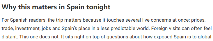 文章进一步分析说,近年来,西班牙积极寻求经济多元化、减少对传统市场依赖的新路径。像此次这样的高层访问已成为推进国家利益、寻找新合作伙伴的重要方式。文章认为,这些举措在竞争激烈的全球环境下,对西班牙的未来正变得尤为重要。