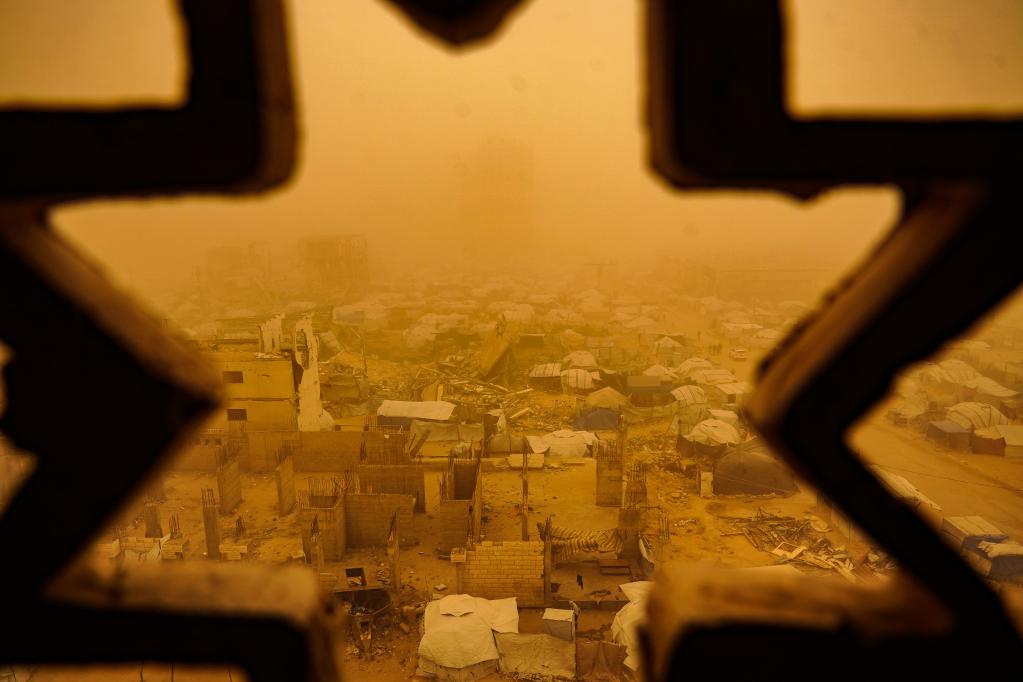 这是3月14日在加沙城拍摄的沙尘天气中的一处临时帐篷营地。新华社发(里泽克·阿卜杜勒贾瓦德摄)