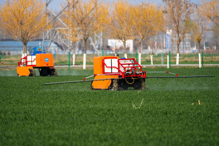 2026年3月9日,山东省肥城市安驾庄镇洼里无人智慧农场内,由山东农业大学团队自主研制的喷药机器人在喷洒农药。新华社记者 朱峥 摄