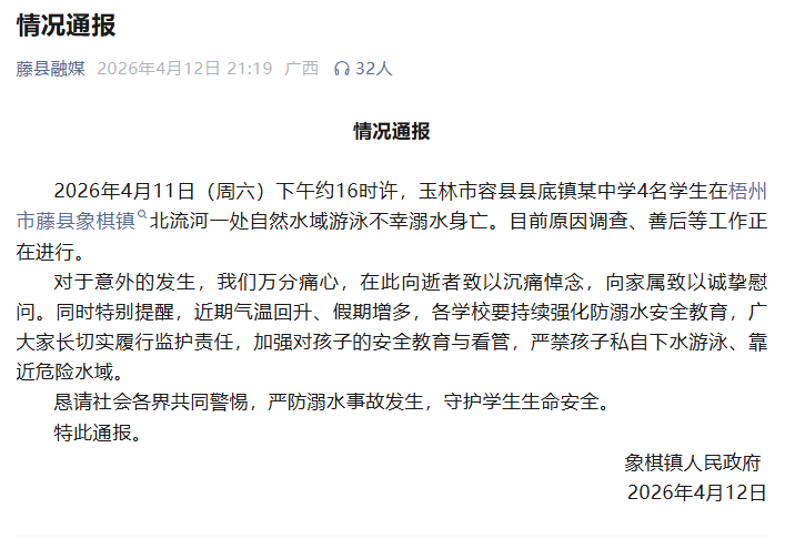 中国网4月13日讯 广西梧州市藤县象棋镇人民政府12日通报称,4月11日(周六)下午约16时许,玉林市容县县底镇某中学4名学生在梧州市藤县象棋镇北流河一处自然水域游泳不幸溺水身亡。目前原因调查、善后等工作正在进行。