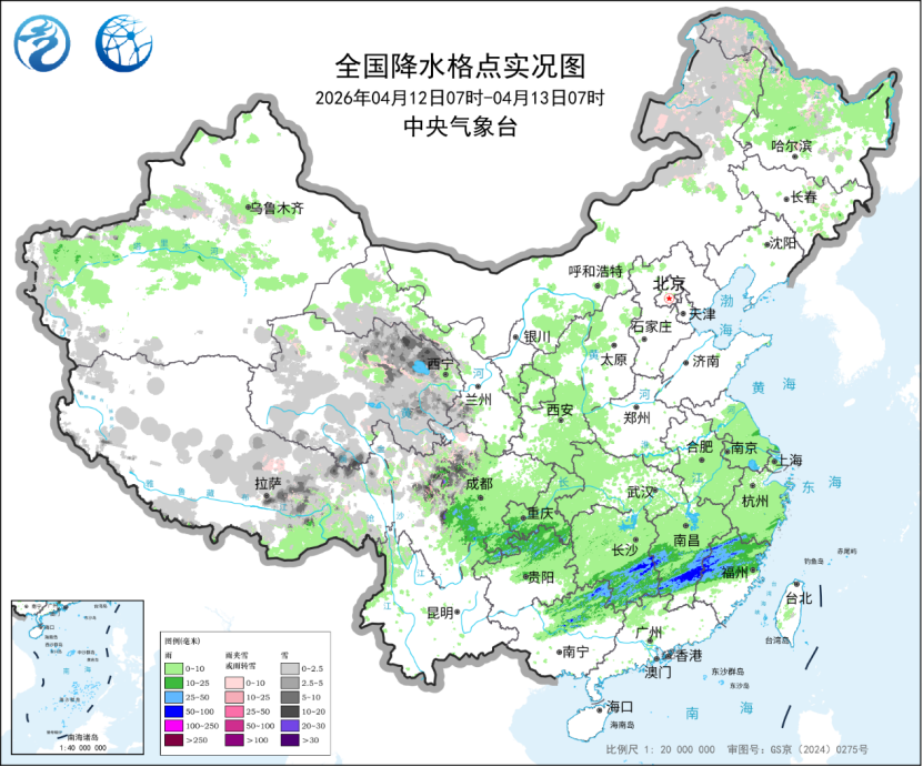 中国网4月13日讯 据中央气象台网站消息,12日,湖南南部、江西南部、福建西北部等地部分地区出现中到大雨,局地暴雨,湖南衡阳、江西赣州等局地大暴雨;青海北部和东部、西藏东部、川西高原等地部分地区出现中到大雪或雨夹雪,四川甘孜局地暴雪。未来三天,上述地区仍多降雨降雪天气,公众需关注气象部门发布的预报预警信息,外出注意路面湿滑和交通安全。