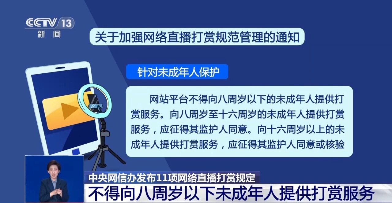 记者今天(13日)从中央网信办获悉,为进一步加强网络直播打赏管理,规范网络直播营利行为,推动网站平台合规健康运营,切实维护网民合法权益,中央网信办发布“关于加强网络直播打赏规范管理的通知”。