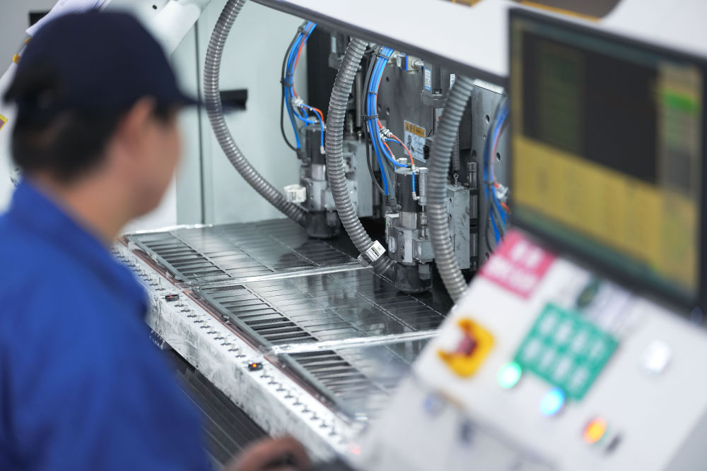 工作人员在吉林化纤集团国兴复材有限公司车间操控雕刻机加工碳纤维复材制件(2025年9月17日摄)。新华社记者 许畅 摄