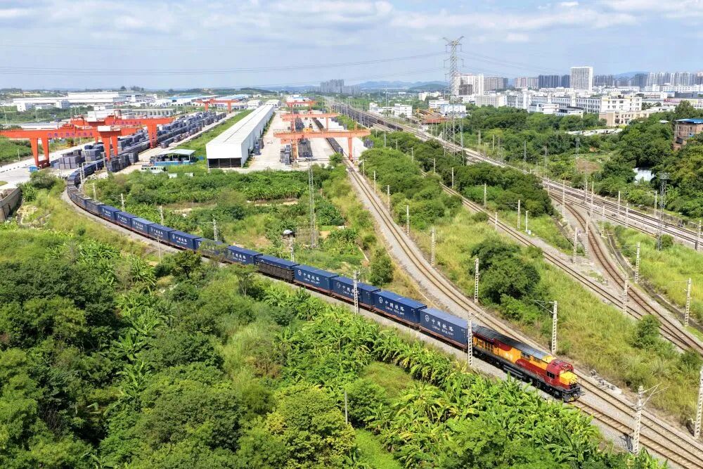 2025年9月23日,一辆中越班列驶出南宁国际铁路港(无人机照片)。新华社记者 邢广利 摄