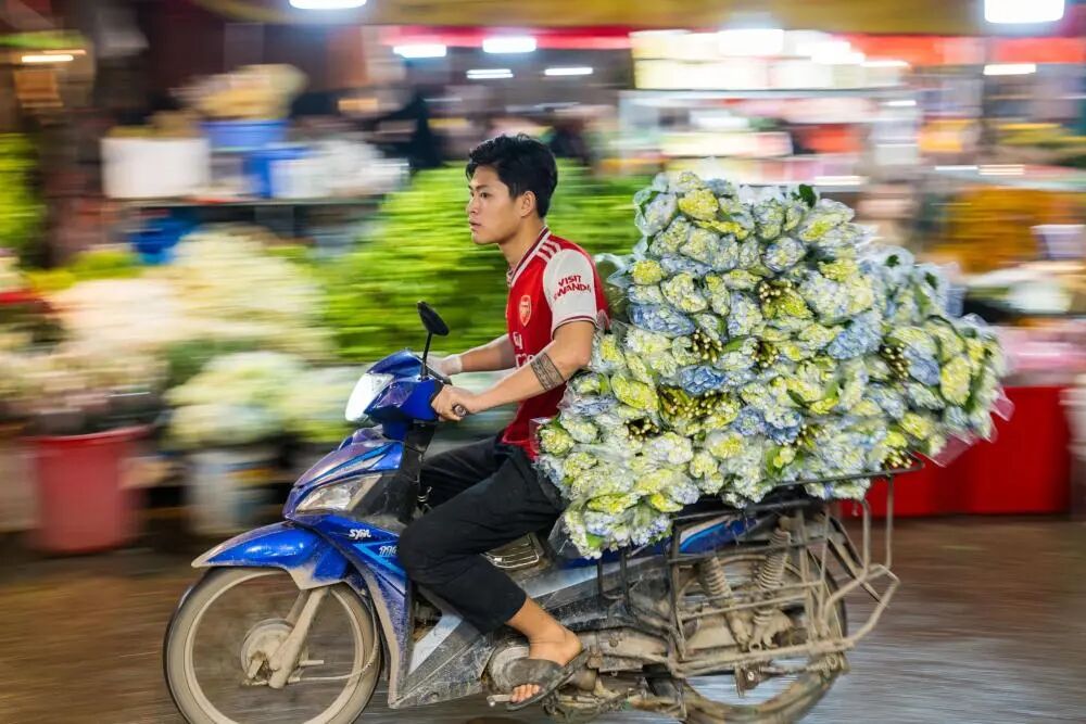 2025年3月28日,一名商贩在越南河内广霸花市运送鲜花。新华社记者 朱炜 摄